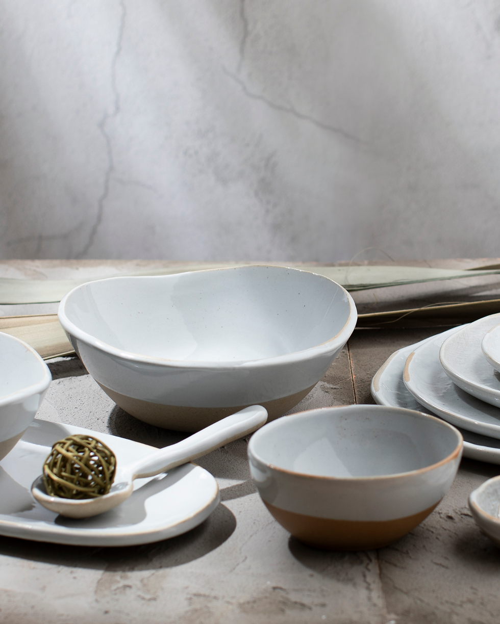 A handcrafted collection offering a contemporary take on the past. The top half is glazed with weathered hues of blue, while the bottom is unglazed for an authentic look and texture. Along with the irregular sides, Craftstone brings natural elements onto your tabletop.